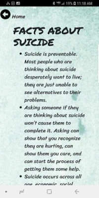Features of the app include: • Education about warning signs that people who care contemplating suicide may display • Risk factors that can contribute to thoughts of suicide • Educational facts about suicide • How to help yourself or someone else • What not to do when yourself or someone else is thinking about suicide