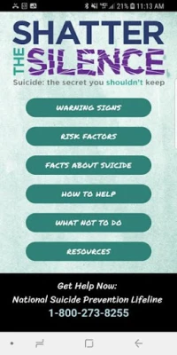 Shatter the Silence Suicide mobile application is an excellent resource to learn more about preventing suicide. The application includes information about risk factors, warning signs, helpful and unhelpful things to say and a variety of resources available to yourself, or someone you know, who may be at risk or contemplating suicide. The application features encouraging messages of support and hope, and quick access to the National Suicide Prevention Lifeline which has trained counselors available to help 24/7 to help those in need.