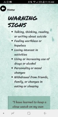 Features of the app include: • Education about warning signs that people who care contemplating suicide may display • Risk factors that can contribute to thoughts of suicide • Educational facts about suicide • How to help yourself or someone else • What not to do when yourself or someone else is thinking about suicide