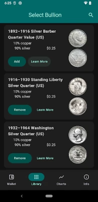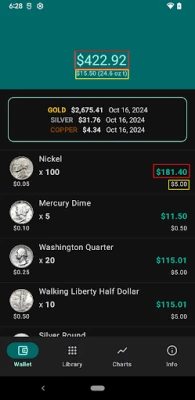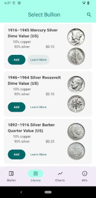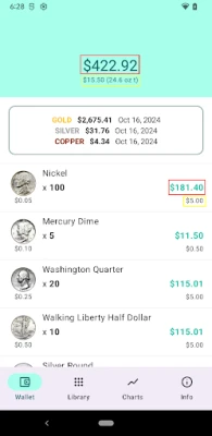 The app is a virtual wallet where user can select the silver coins and quantities and see the total real value based on metal content. The nominal value is shown as well.