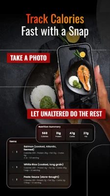 - Technology: The UNALTERED App uses the latest advancements in AI (artificial intelligence) to offer quick and personalized support. For example, the UNALTERED App enables you to simply take a photo of your food and have its calories logged automatically for you, making calorie tracking quicker and easier than ever before!