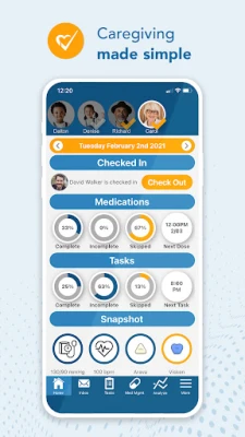 View a summary of all calendar events, journal entries, tasks, and medications due on a given day for the selected Care Recipient. Check in or out for a Care Recipient and quickly access modules from the Home Screen to enter data.