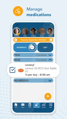 Organize all medication and supplement needs through the Meds module. Customizable icons displaying the form, shape, and color can add extra clarification the right medication is taken. Push notification alerts also help guarantee your Care Recipient receives every medication at its scheduled time.