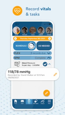 Customizable Tasks allow you to keep a record of your care recipient's wellbeing. Schedule when to track needs such as vitals, intake/output, activity and sleep, mood and behavior, or create your own. Real time reminders of when tasks are due help ensure the daily needs of the Care Recipient are met.